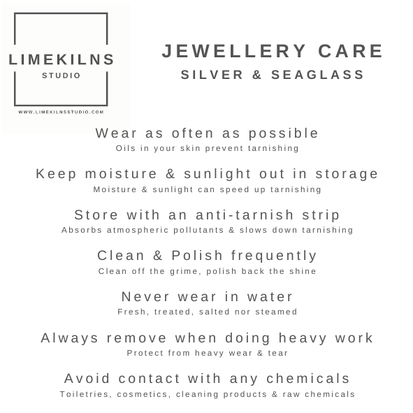 Clean silver with a professional cleaning product (baking soda or lemon are a natural alternative). Buff with a treated polishing cloth to bring back the shine. To awaken the lustre of your sea glass, dab with a little baby oil & let it air dry.