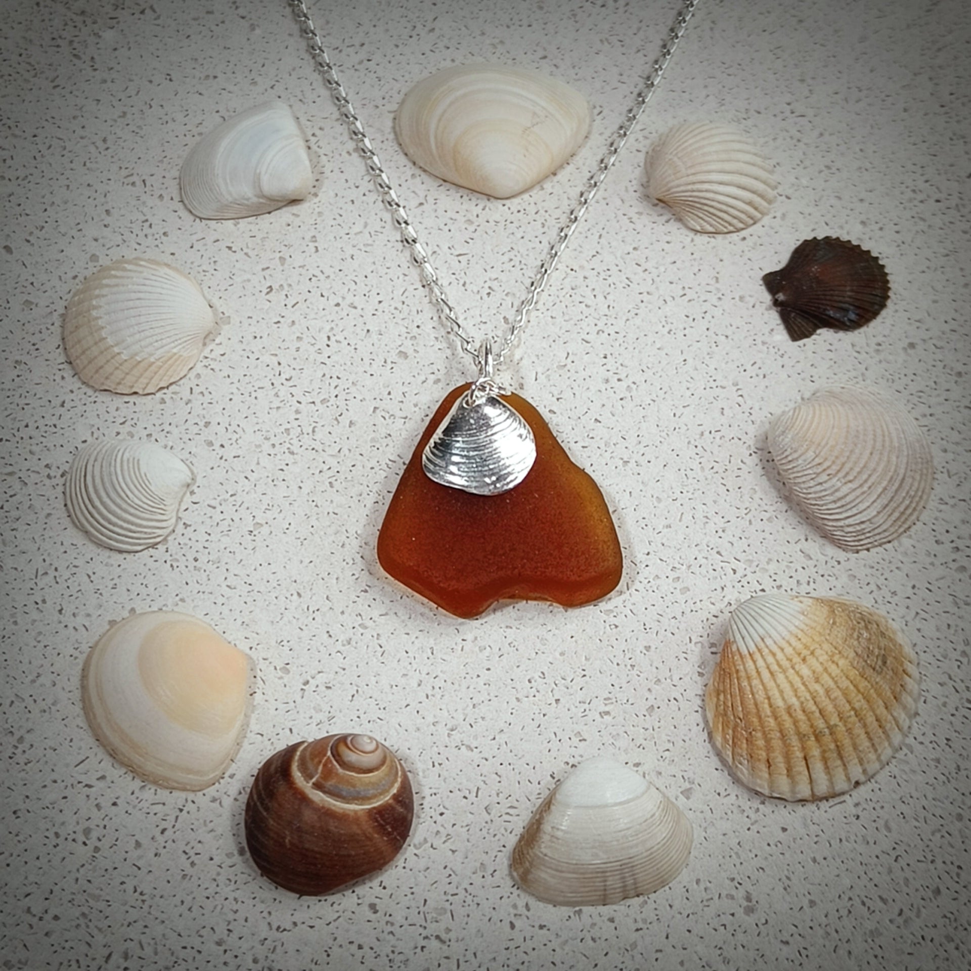 Handmade silver and sea glass necklace. Lovingly created with a stunning fine silver venus sea shell pendant paired with alluring russet brown sea glass, with a beautiful patina that has been formed and forged by the power of the sea. Hung on a stylish sterling silver 18"/45cm diamond cut curb chain.